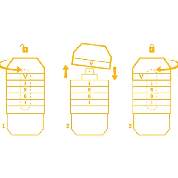 La tapa azul de acero cepillado agrega un aspecto táctil y multisensorial a VIVO. Terminada con una explosión de brillo naranja neón, al descifrar el código se accede al jugo, alineando verticalmente la «V» con el código 1881 en los anillos.