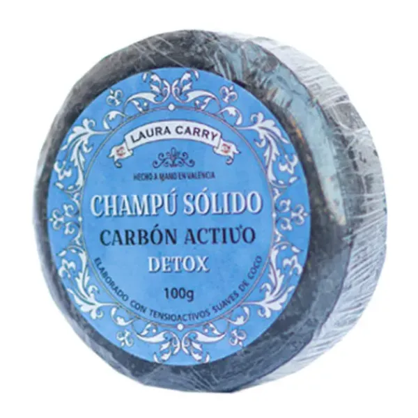 Champú sólido detox de carbón activo. Contiene base limpiadora suave (SCI) procedente del aceite de coco, carbón activo, aceite de comino negro, aloe vera, manteca de cacao, mentol, queratina, romero y cera carnauba.