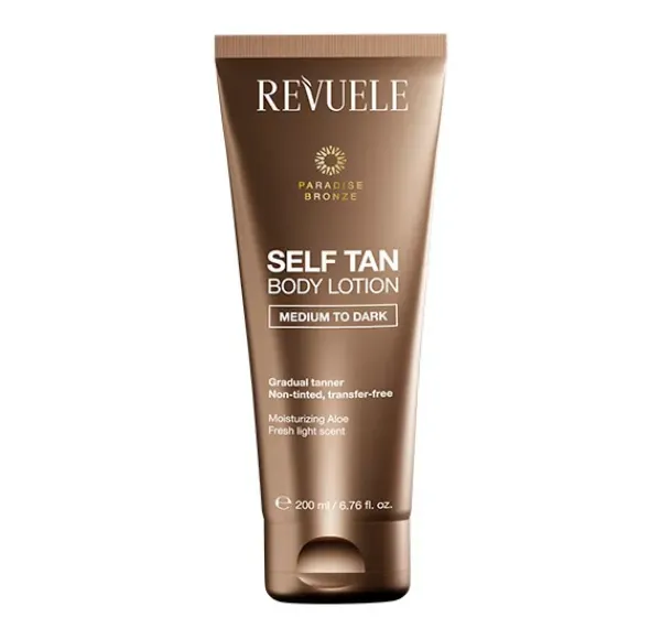 LOCIÓN CORPORAL AUTOBRONCEADORA REVUELE. Este bronceador gradual sin sol le dará a tu piel un impecable efecto bañado por el sol en tan solo unas horas y mantendrá tu saludable brillo veraniego durante días.
