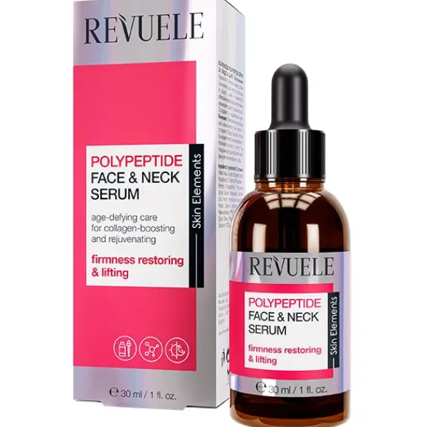 REVUELE POLYPEPTIDE FACE & NECK SERUM es un potente concentrado anti-edad que actúa intensamente para reafirmar la piel. Está diseñado para disminuir la visibilidad de las líneas finas y la flacidez del contorno, contribuyendo a una apariencia notablemente más tersa, suave y juvenil.