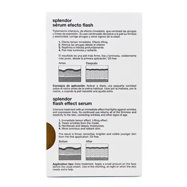El serum efecto flash de Spendor actúa de manera intensiva sobre tu piel dándole una textura lisa y suave, borrando las arrugas y los signos de la edad.