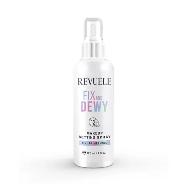 REVUELE MAKEUP SETTING SPRAY FIX AND DEWY es una solución 2 en 1 que prepara la piel y fija el maquillaje hasta por 12 horas.