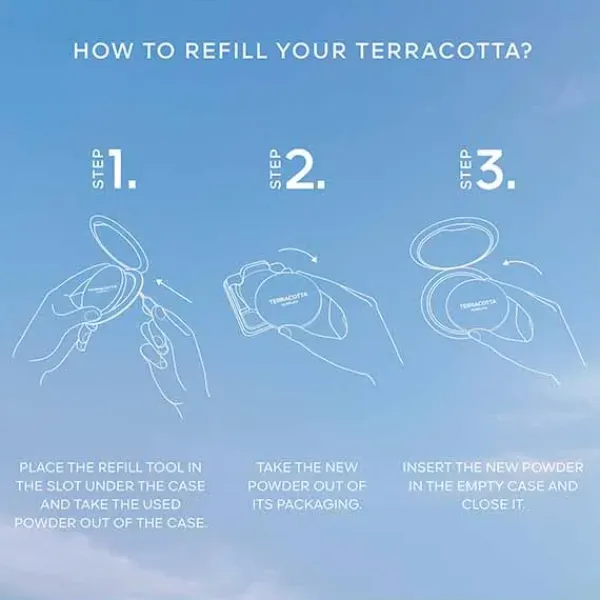 El perfume de los polvos Terracotta invita a la evasión. Las notas de ylang ylang y flor de naranjo envuelven en una agradable sensación. Se acompañan de notas de haba tonka y vainilla con soleadas facetas que encarnan la esencia de Terracotta. Un toque de almizcles blancos aporta dulzura a este perfume adictivo. Los sentidos se despiertan en lugares lejanos.