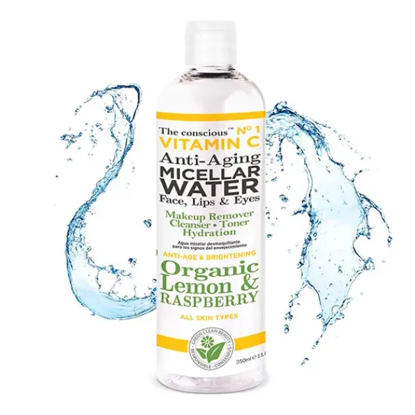 The conscious Agua Limpiadora Micelar Antienvejecimiento con Vitamina C que desafía el envejecimiento, limón orgánico y hojas de frambuesa elimina suavemente todos los rastros de maquillaje con facilidad, limpia, tonifica e hidrata para permitir que su piel naturalmente suave, brillante y resplandeciente resurja.