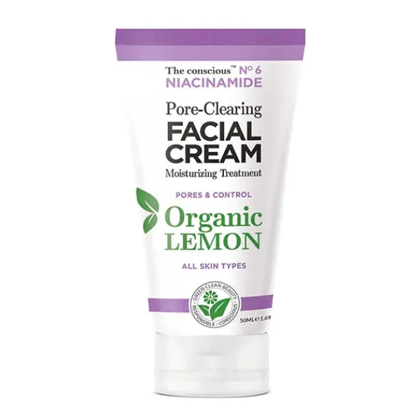 The conscious crema facial control de poros con niacinamida y aceite de limón orgánico hidrata piel y absorbe el aceite para refinar, suavizar y destacar su brillo natural.