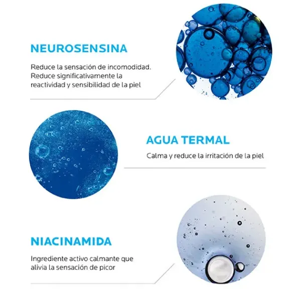 Cuidado de la piel nutritivo y ultra-calmante que asocia Neurosensina y Niacinamida para reducir la hinchazón y la sensación de incomodidad del contorno de ojos y el Agua Termal de la Roche-Posay que calma y protege.