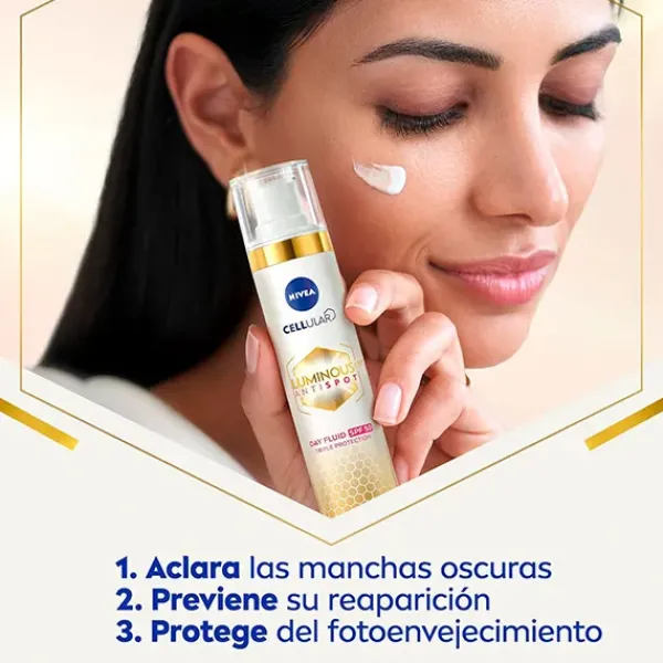 Reduce las manchas y previene su reaparición mientras protege el rostro frente al sol y al fotoenvejecimiento.