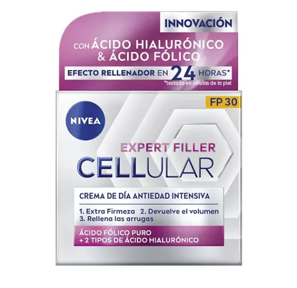 CELLULAR CREMA DE DÍA ANTIEDAD INTENSIVA SPF30: Esta crema dia con SPF30, proporciona una piel de aspecto más joven gracias a su fórmula con Ácido Fólico Puro y, Micro y Macro Ácido Hialúrónico, para aportar un extra de firmeza, devolver el volumen a la piel y rellenar las arrugas. Esta combinación de poderosos activos antiedad aportan un efecto rellenador en 24h* y combaten la pérdida de firmeza y volumen.